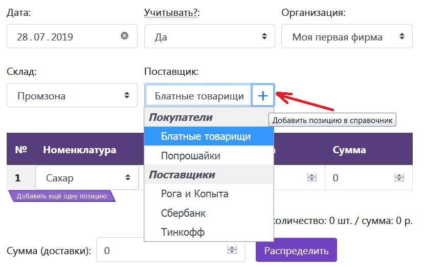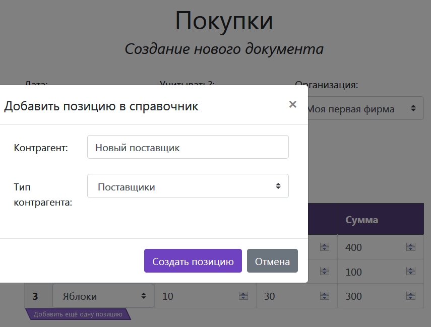 Если в одном из справочников не окажется нужной позиции, например, появился новый поставщик, вы можете дополнить справочник прямо в самом документе. Просто нажмите синий плюсик в правом углу выпадающего списка и заполните необходимые данные в появившемся окошке. После создания, новая позиция будет автоматически выбрана.