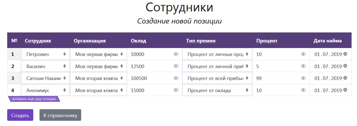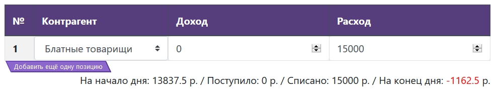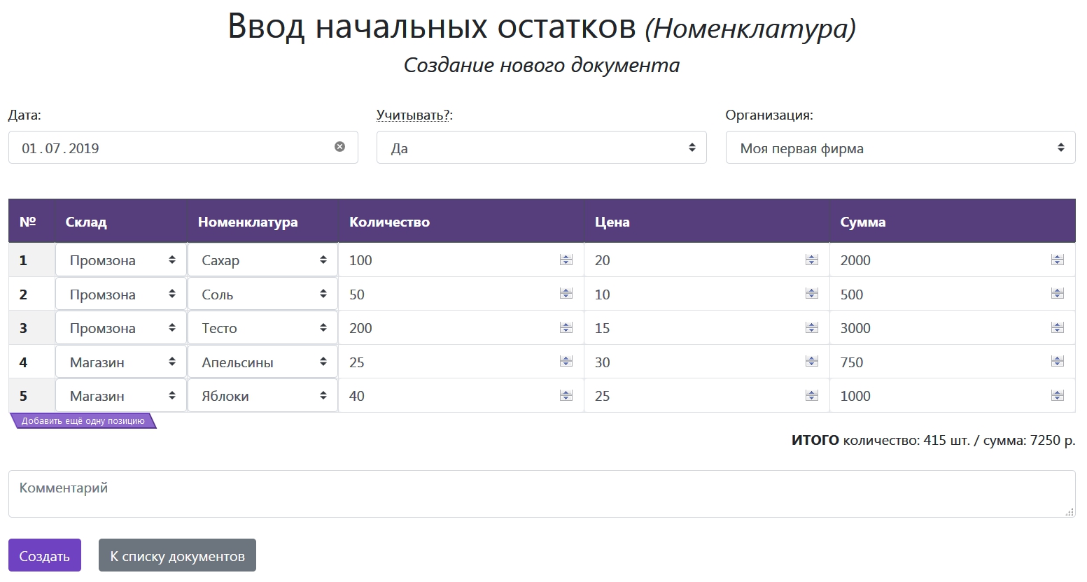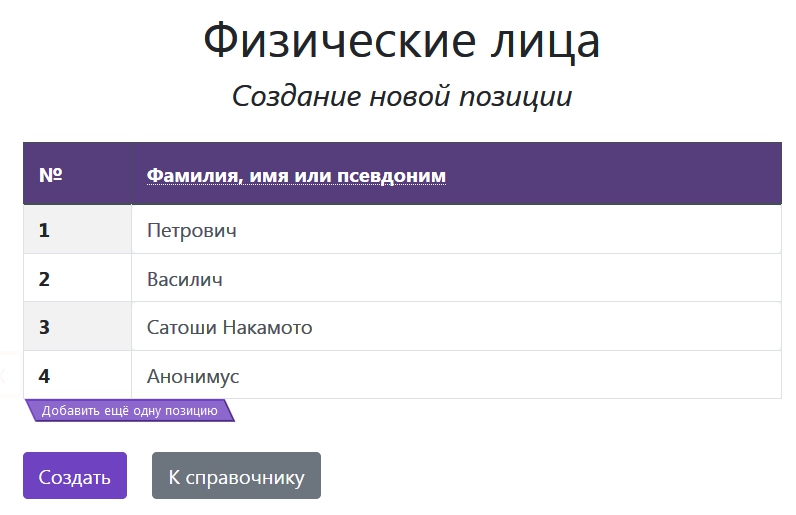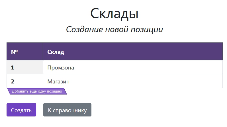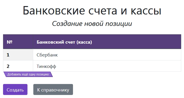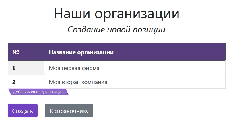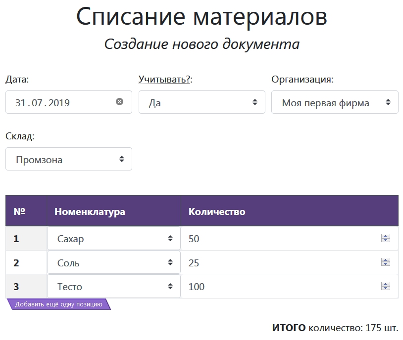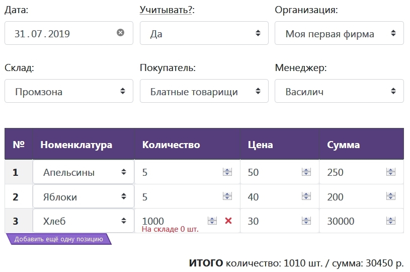 Позиций в табличной части может быть сколько угодно, для добавления новой строки просто нажмите кнопку «Добавить ещё одну позицию».