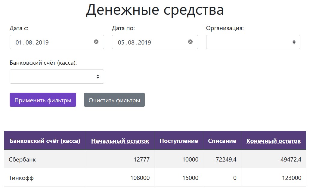 Содержит аналитику по компаниям и банковским счетам/кассам. Для большей наглядности, списание показывается отрицательной суммой, поступление - положительной.