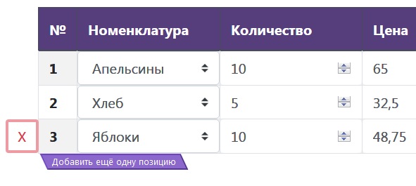 Если какую-то строку понадобиться удалить – наведите указатель мыши на порядковый номер позиции и нажмите на появившийся слева красный крестик.