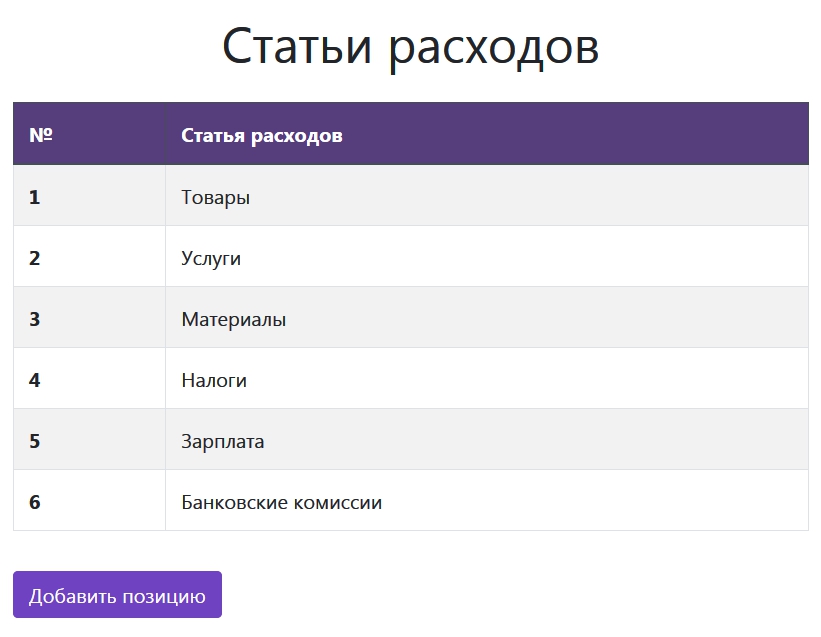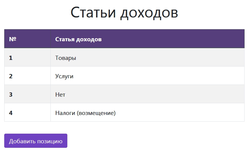 Далее идут справочники Статьи доходов и Статьи расходов. Данные справочники имеют предустановленные позиции, но вы можете дополнить их своими статьями для более детальной аналитики.