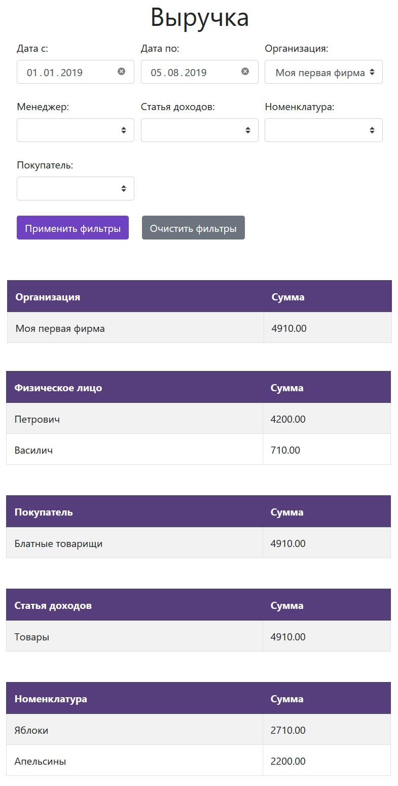 Содержит аналитику по компаниям, менеджерам, статьям доходов, номенклатуре и покупателям. Отрицательные суммы могут встретиться только если в выбранном периоде были возвраты от покупателей.