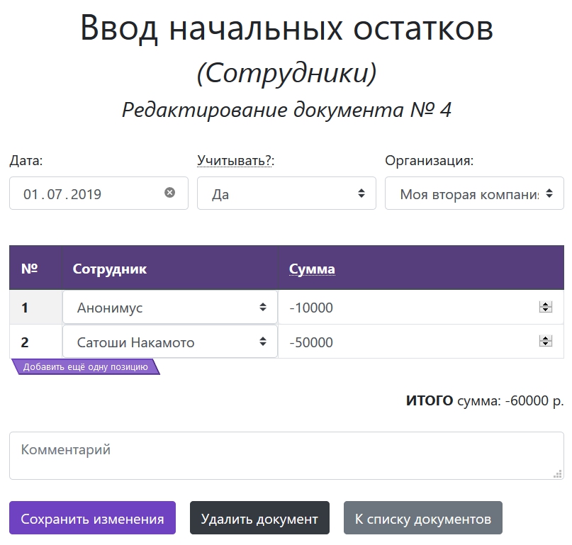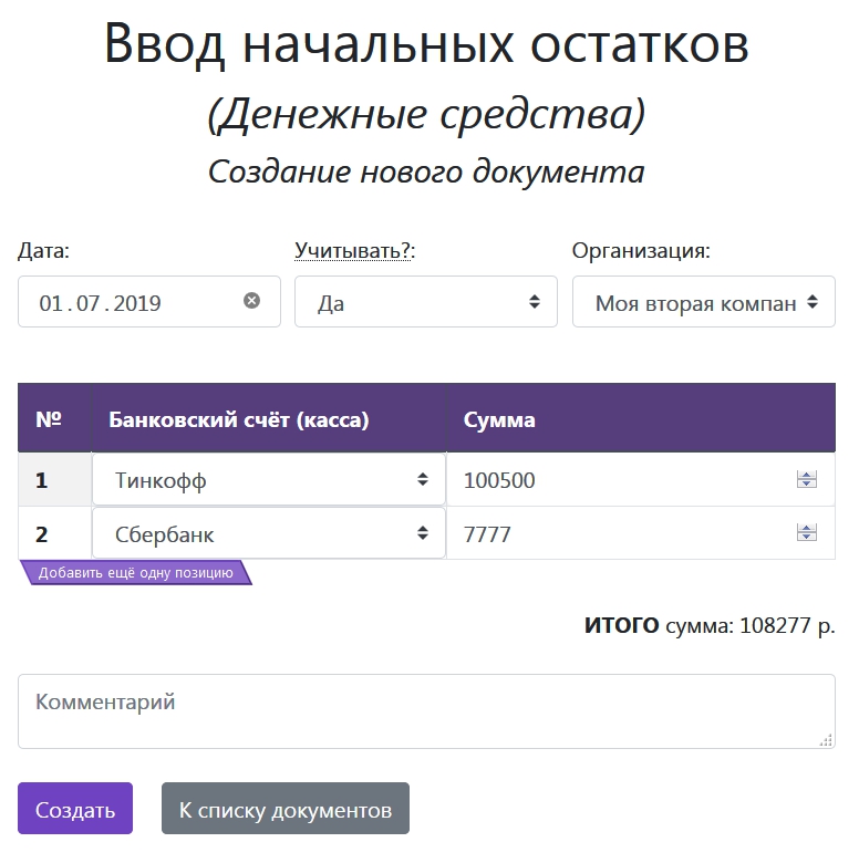 Ввод начальных остатков