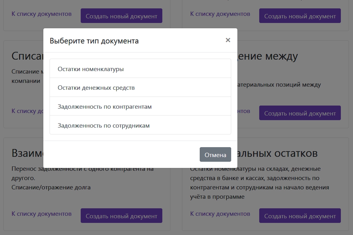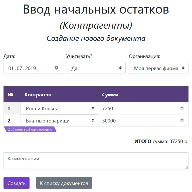 После заполнения справочников можно наконец переходить к Документам. В самом низу списка вы увидите Ввод начальных остатков. Если ваша компания открылась не вчера, то наверняка у вас уже есть какие-то товары на складе, деньги на счёте, кому-то из контрагентов вы должны, а кто-то наоборот должен вам. Именно с помощью заполнения данных документов вы сможете начать учёт не с чистого листа, а отталкиваясь от имеющихся на данный момент данных.