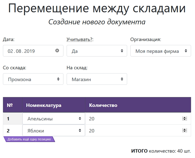 Указываете склады, между которыми перемещаются товарно-материальные ценности, позиции и их количество. Сумма по перемещаемым товарам определиться автоматически.