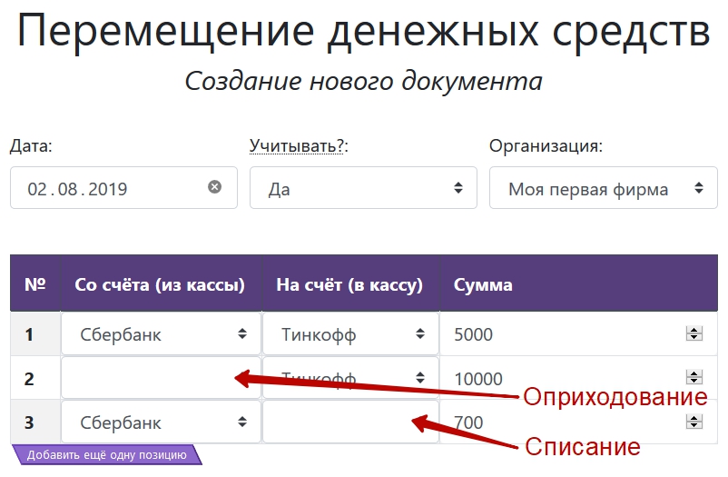 Помимо основного предназначения вы можете использовать документ для отражения поступления или, наоборот, списания средств. В таком случае просто оставьте пустыми ячейки "Со счёта" или "На счёт".