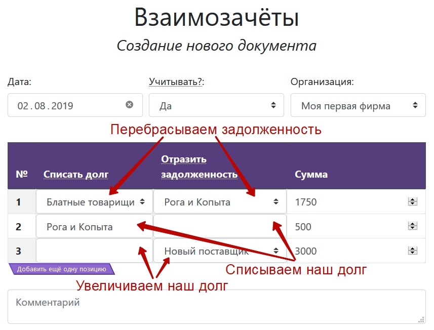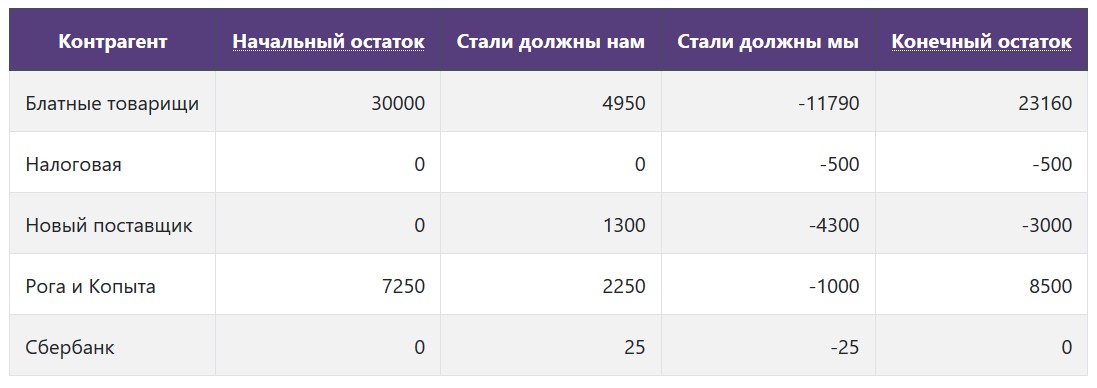Здесь отражается перенос задолженности с одного контрагента на другого, а также списание и отражение вашего долга перед контрагентами.