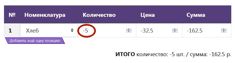 Возврат от покупателя заводится аналогично, за исключением того, что количество указываем со знаком минус (цена и сумма автоматически станут отрицательными). Только убедитесь, что вы правильно вводите цену – она должна быть точно как в документе первоначальной продажи.