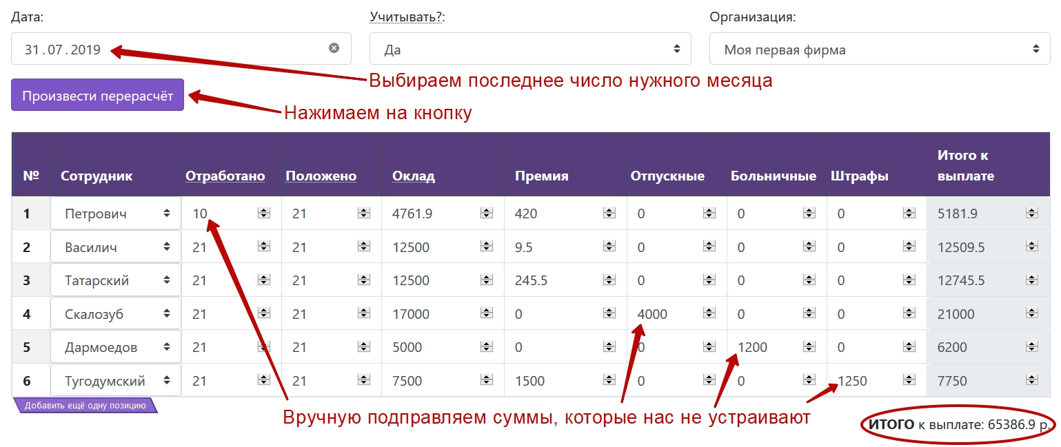 После того, как программа произвела все расчёты, вы можете подправить вручную любую сумму, которая вас не устраивает, а также вбить отпускные, больничные или штрафы.
