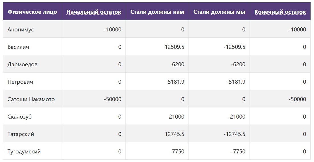 Положительная сумма - должны нам, отрицательная - должны мы